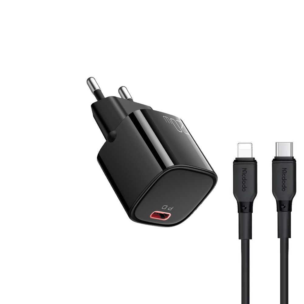 Зарядний пристрій Mcdodo CH-4690 виконаний у компактному корпусі з міцного полікарбонату (PC), що забезпечує безпеку та довговічність. З розмірами 32.4 × 35.7 × 72.1 мм він зручний для використання вдома чи в дорозі. Чорний колір і мінімалістичний дизайн додають елегантності, а EU-вилка гарантує сумісність із європейськими розетками. У комплекті поставляється кабель Type-C to Lightning.