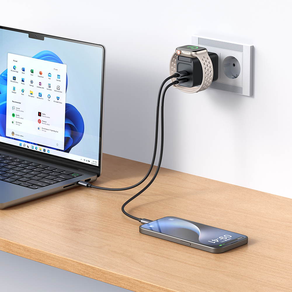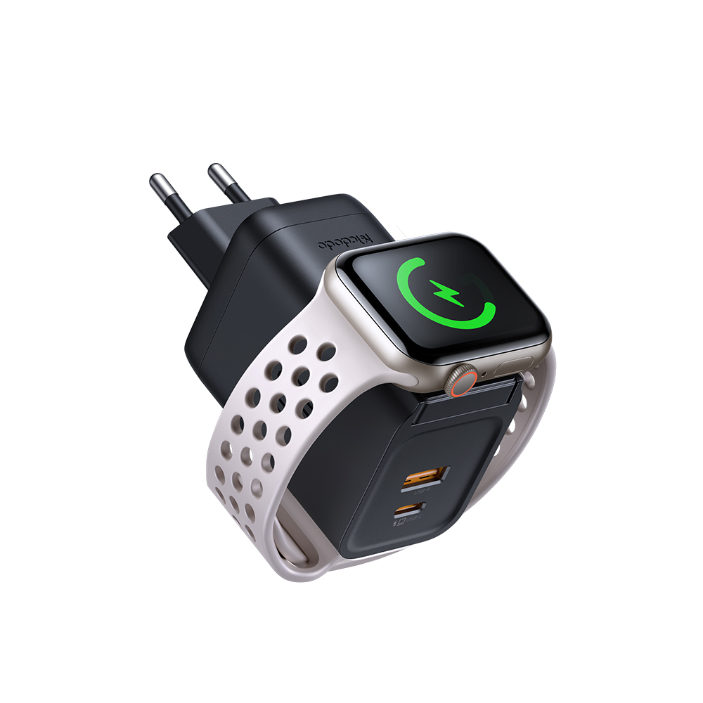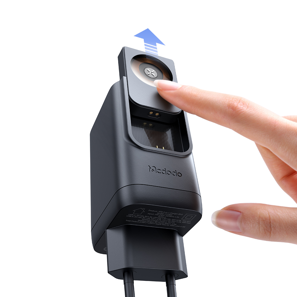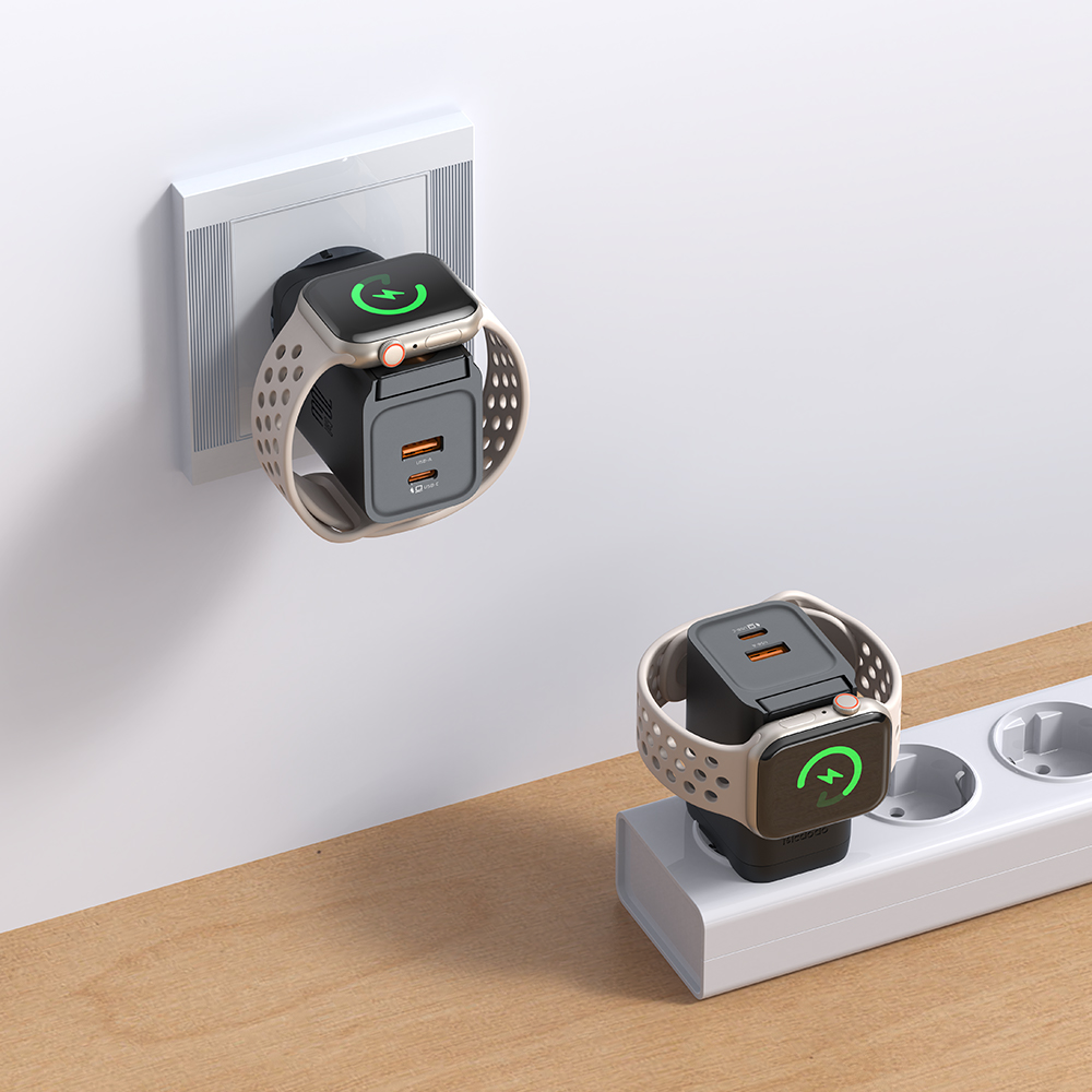 Модель виконана в компактному форм-факторі з надійного вогнестійкого матеріалу Fireproof PC та оснащена EU-розеткою, що робить її зручною для щоденного використання та подорожей. Вбудований модуль для зарядки Apple Watch має магнітну фіксацію і може використовуватися як частина адаптера або окремо за допомогою комплектного кабелю Type-A to POGO PIN 0.6m, забезпечуючи мобільність у дорозі та зарядку через автоадаптер, павербанк чи ноутбук. Лаконічне виконання підкреслює універсальність і практичність, а формат 2-in-1 дозволяє замінити декілька зарядних пристроїв одним — для годинника, смартфона та інших гаджетів.