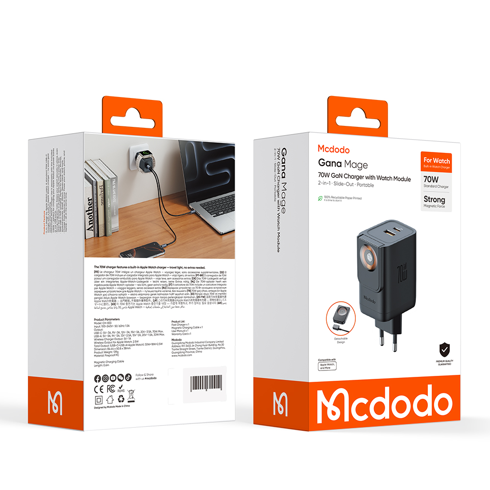 Mcdodo CH-8330 - це універсальний 2в1 зарядний адаптер потужністю 70W, який поєднує швидкісний порт USB-C та USB-A з вбудованим бездротовим модулем для Apple Watch потужністю 2.5W. Підтримка широкого діапазону вихідних параметрів дозволяє швидко заряджати смартфони, планшети, навушники, ноутбуки та інші сумісні пристрої з максимальним ефектом, зокрема завдяки USB-C 70W, що підходить навіть для більш вимогливих гаджетів. Адаптер підтримує одночасне заряджання кількох пристроїв, автоматично розподіляючи потужність для стабільної та ефективної роботи, а система із багатоетапним рівнем захисту гарантує безпечне використання в будь-яких умовах.