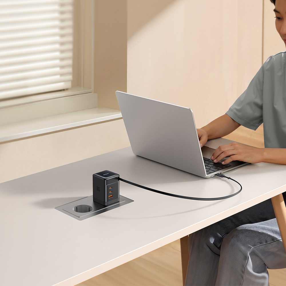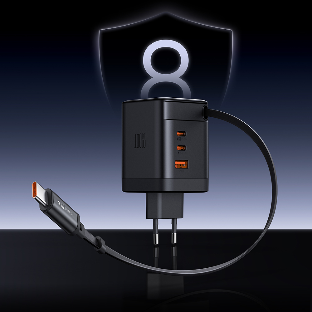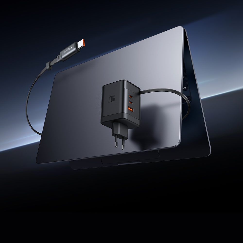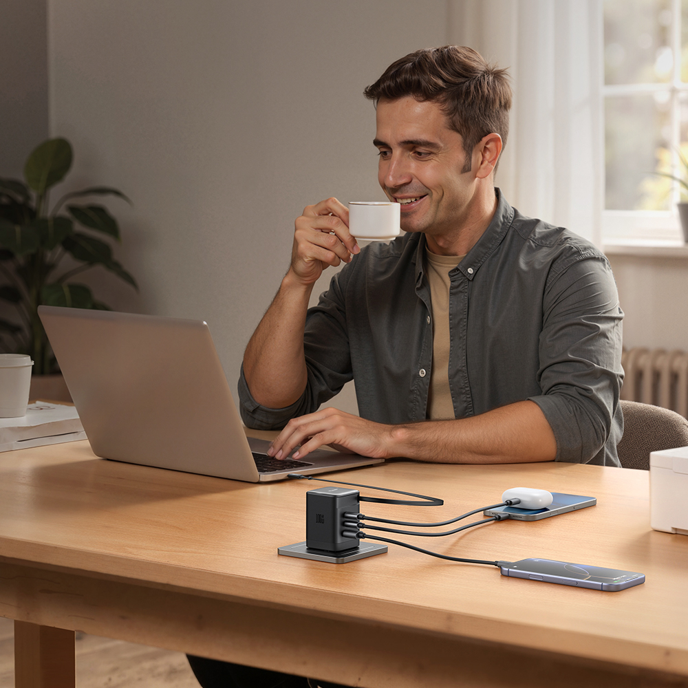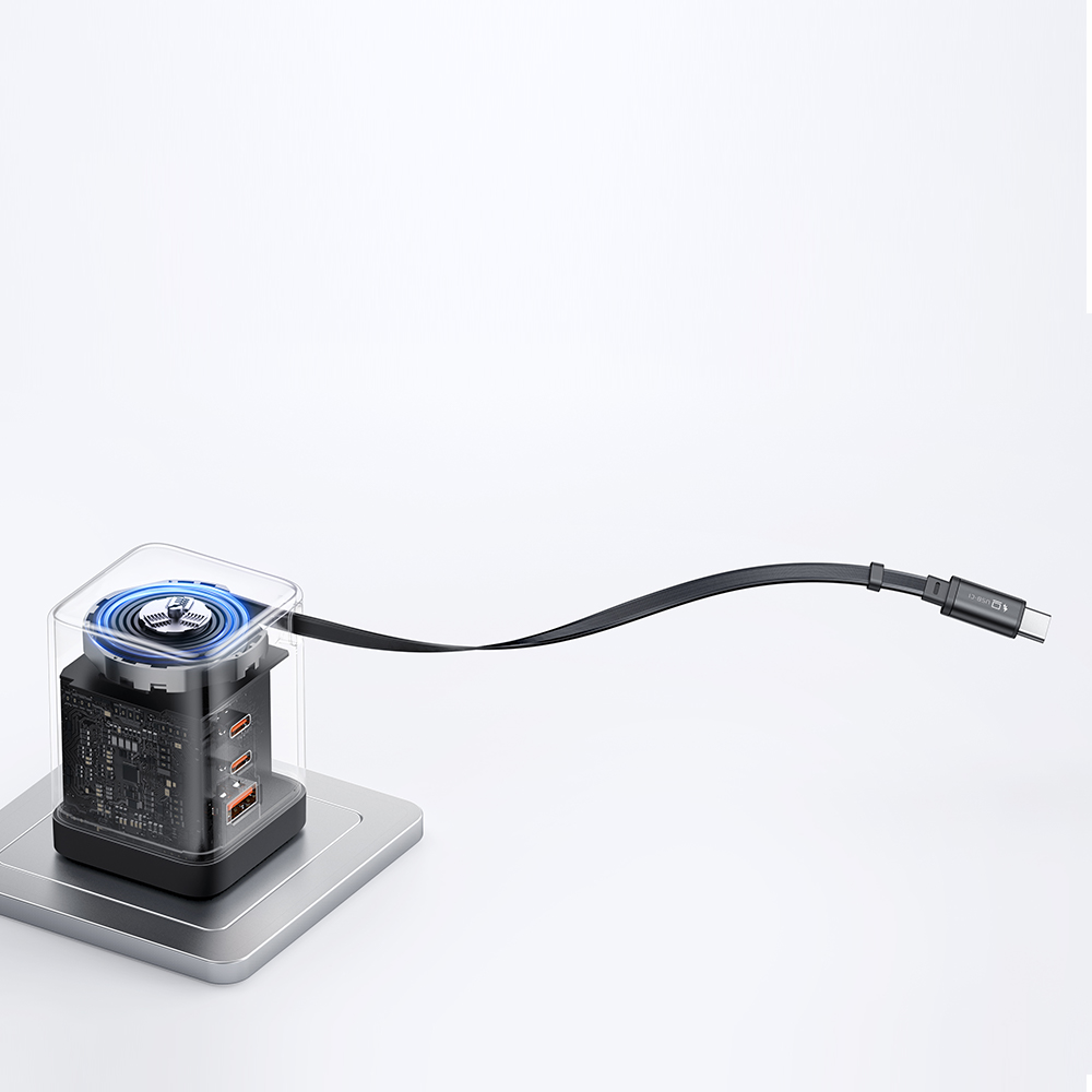 • ДизайнСтанція має ергономічний вертикальний дизайн, що дозволяє значно зекономити місце на робочому столі. Корпус виготовлено з преміального вогнетривкого полікарбонату з матовою текстурою. На передній панелі розташовані порти для підключення зовнішніх кабелів, а вбудований висувний кабель USB-C акуратно ховається всередині корпусу, коли він не потрібен. Завдяки GaN-технології станція не перегрівається навіть за максимального навантаження 100 Вт. Надійна система захисту контролює напругу та температуру, забезпечуючи стабільну роботу всієї підключеної техніки в режимі 24/7.