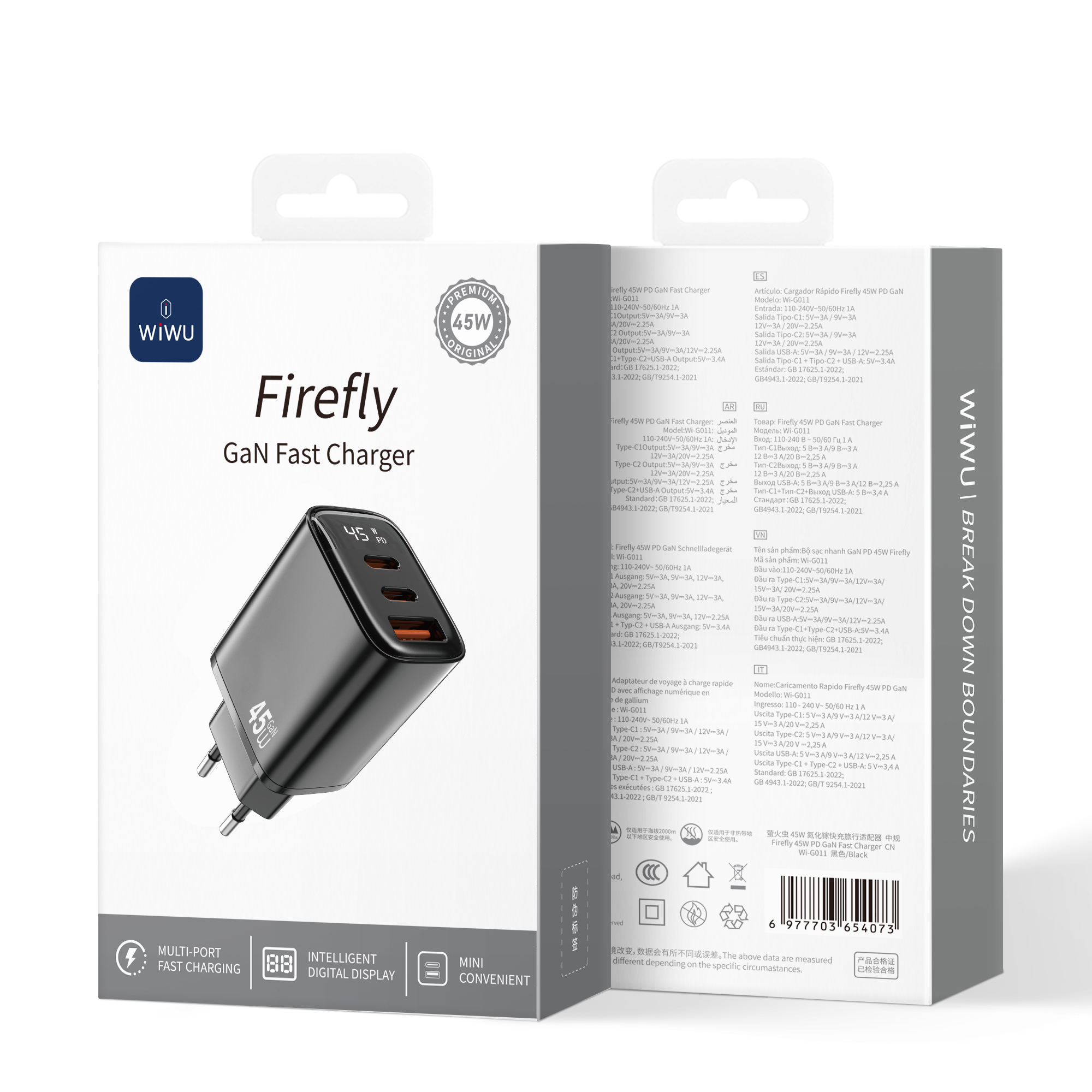 WiWU Wi-G011 оснащений одразу трьома портами: два USB-C та один USB-A, що дозволяє заряджати кілька пристроїв одночасно. Загальна максимальна потужність адаптера — 45 Вт, а підтримка широкого діапазону вихідних режимів (USB-C1 | C2: 5V⎓3A | 9V⎓3A | 12V⎓3A | 20V⎓2.25A; USB-A: 5V⎓3A | 9V⎓2A | 12V⎓2.5A) гарантує ефективну та стабільну зарядку сучасних смартфонів, планшетів, навушників та інших гаджетів. Інтелектуальна система адаптації струму визначає оптимальні параметри для кожного підключеного пристрою, забезпечуючи безпечну та швидку зарядку без перегріву або перевантажень.