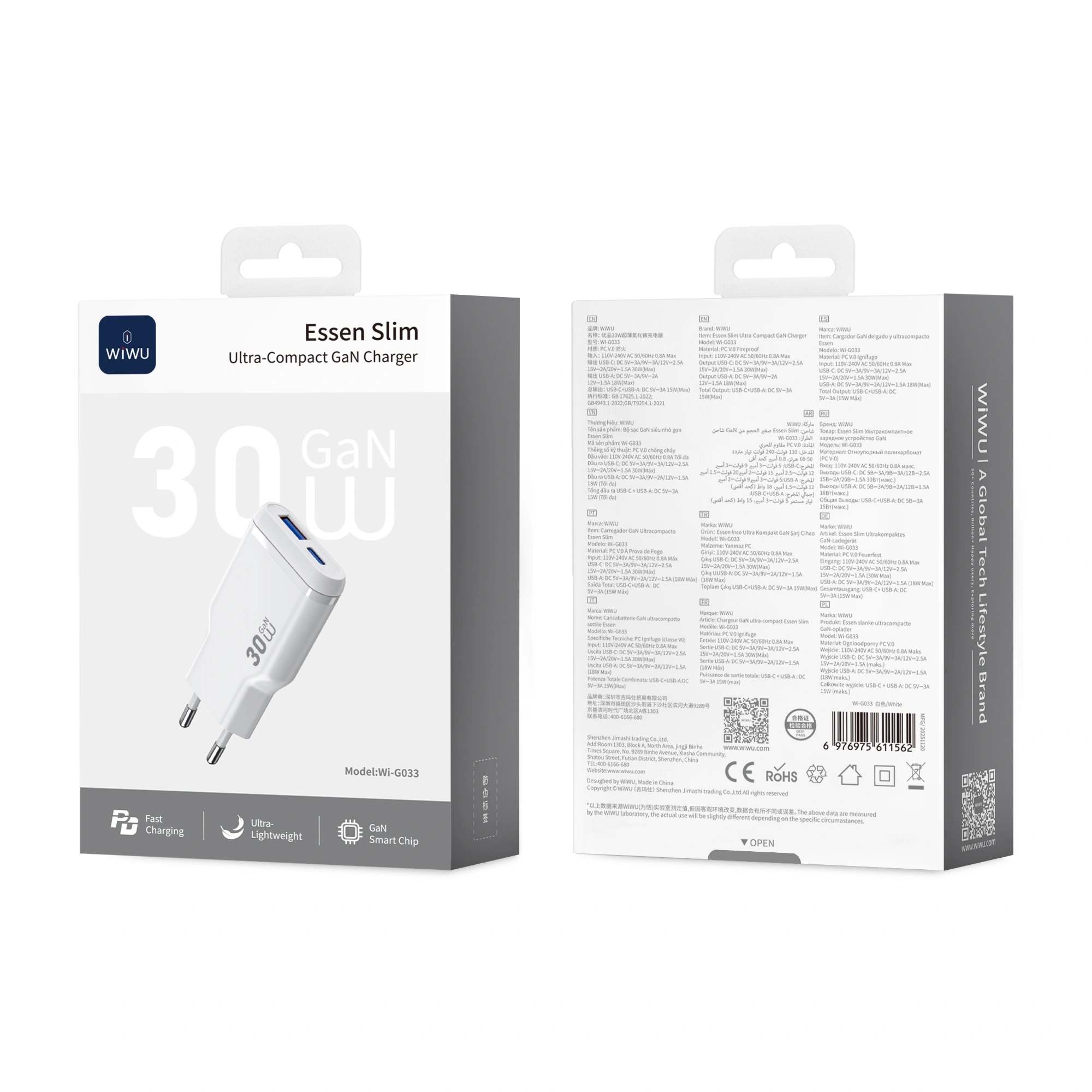 WIWU Essen Slim Wi-G034 — це інноваційний зарядний пристрій, створений за технологією Ultra GaN, що дозволило радикально зменшити товщину корпусу без втрати продуктивності. Адаптер має загальну потужність 45 Вт і оснащений двома портами USB-C, що дозволяє одночасно швидко заряджати iPhone та iPad або підживлювати компактний ноутбук. Завдяки підтримці протоколів PD 3.0 та PPS, пристрій інтелектуально розподіляє енергію, забезпечуючи максимальну швидкість зарядки для кожного підключеного гаджета при мінімальному виділенні тепла.