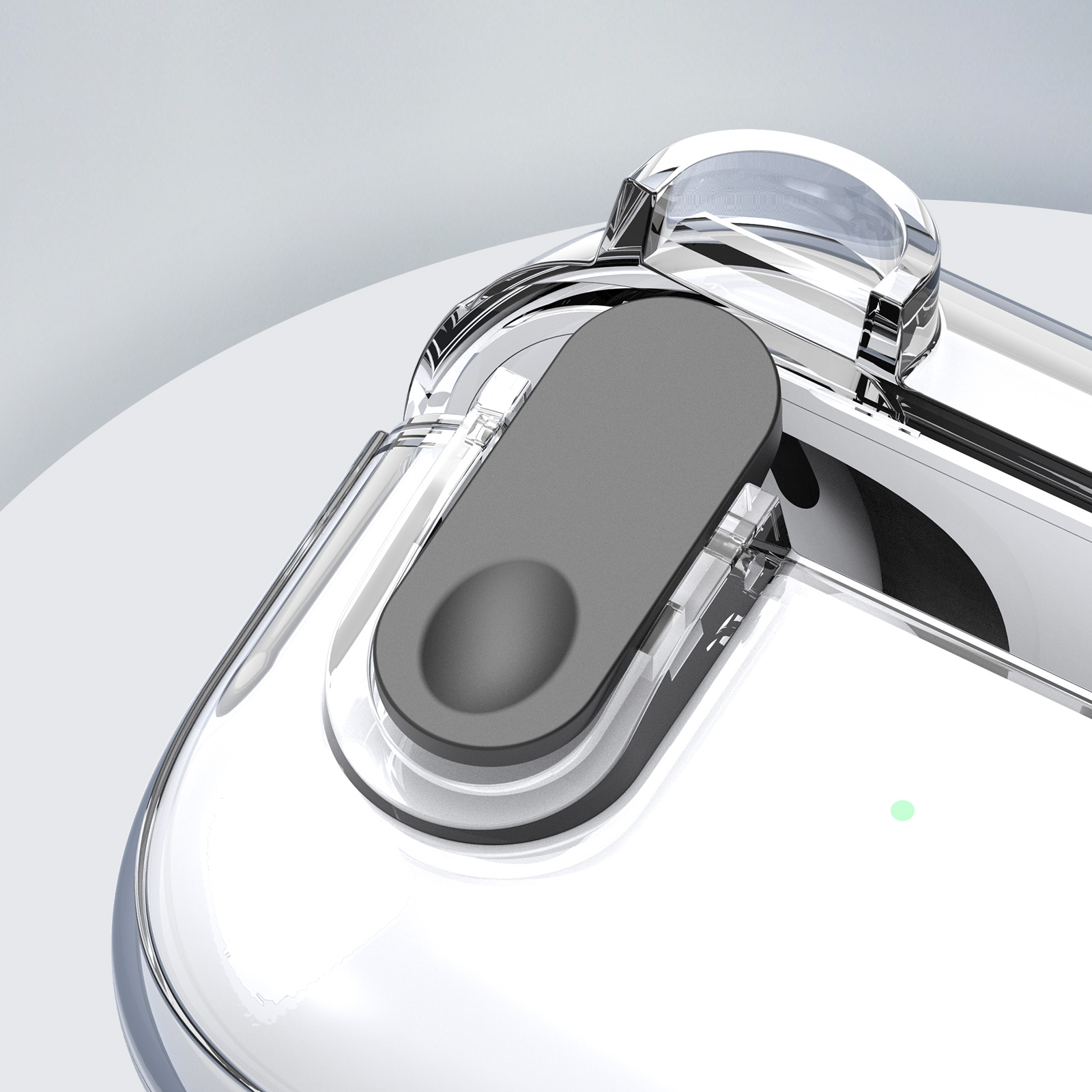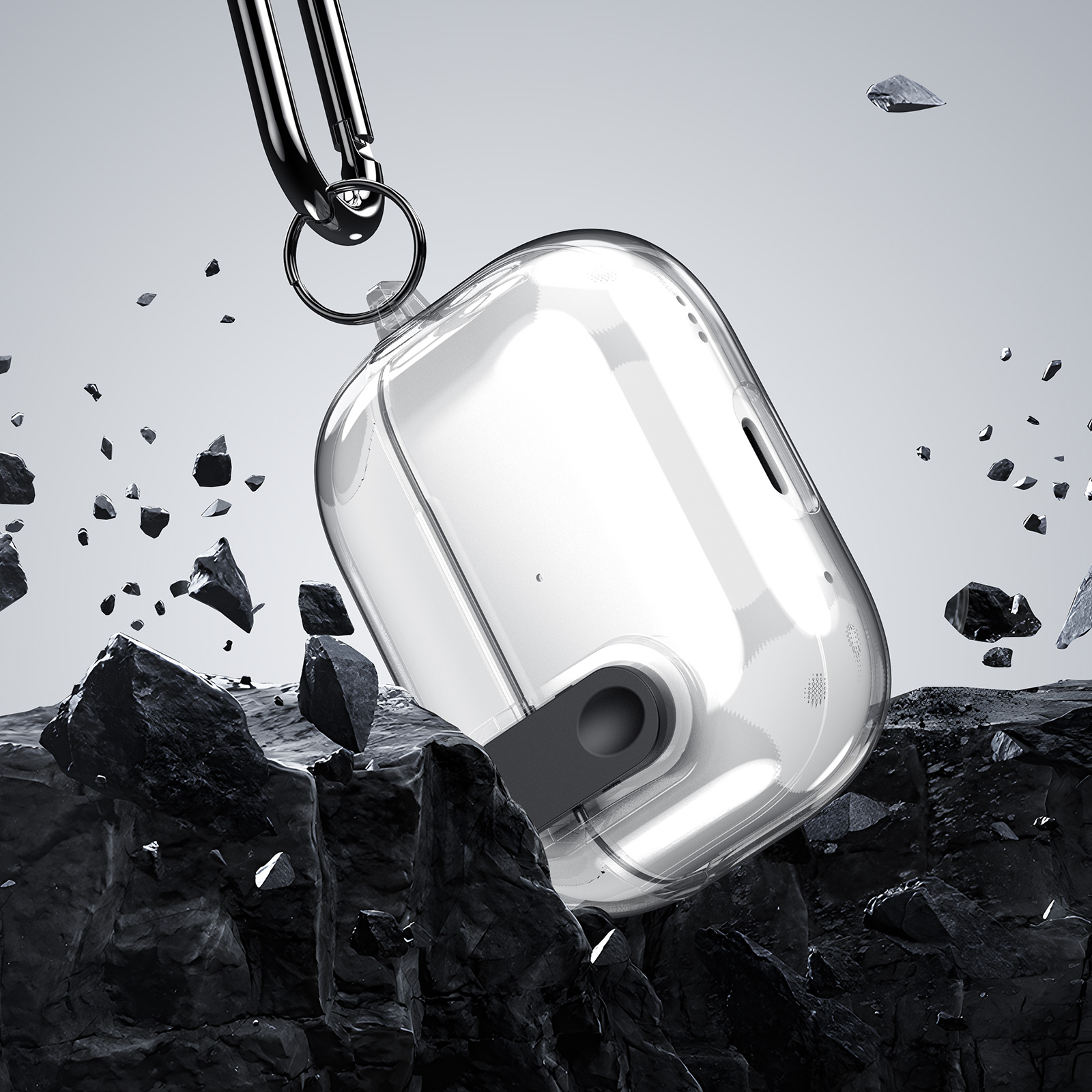 Чохол виготовлений із комбінації TPU та PC, що забезпечує ефективний захист від подряпин, потертостей і випадкових ударів. Модель оснащена застібкою, яка утримує кришку футляра закритою і запобігає її випадковому відкриванню під час носіння. Конструкція передбачає точні вирізи для зарядки та зручного доступу до навушників, без потреби знімати чохол у процесі використання. Комплект доповнений карабіном, що робить повсякденне транспортування навушників більш зручним та безпечним.