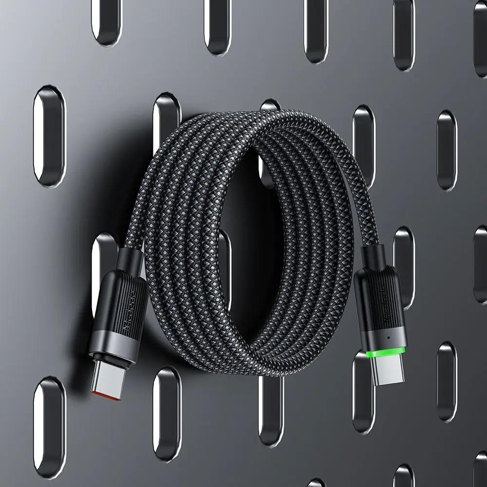 • ДизайнГоловна особливість дизайну — магнітна структура, яка перетворює звичайний кабель на футуристичний аксесуар. Кабель має міцне силіконове обплетення, яке дуже приємне на дотик, легко чиститься і витримує тисячі згинань без пошкоджень. Магніти розташовані з ідеальним інтервалом, щоб кабель тримав форму навіть у сумці чи рюкзаку. Посилені з'єднання біля конекторів запобігають зламам, а лаконічне виконання в чорному кольорі підкреслює преміальність лінійки. Це ідеальний вибір для тих, хто цінує порядок на робочому столі та в автомобілі.