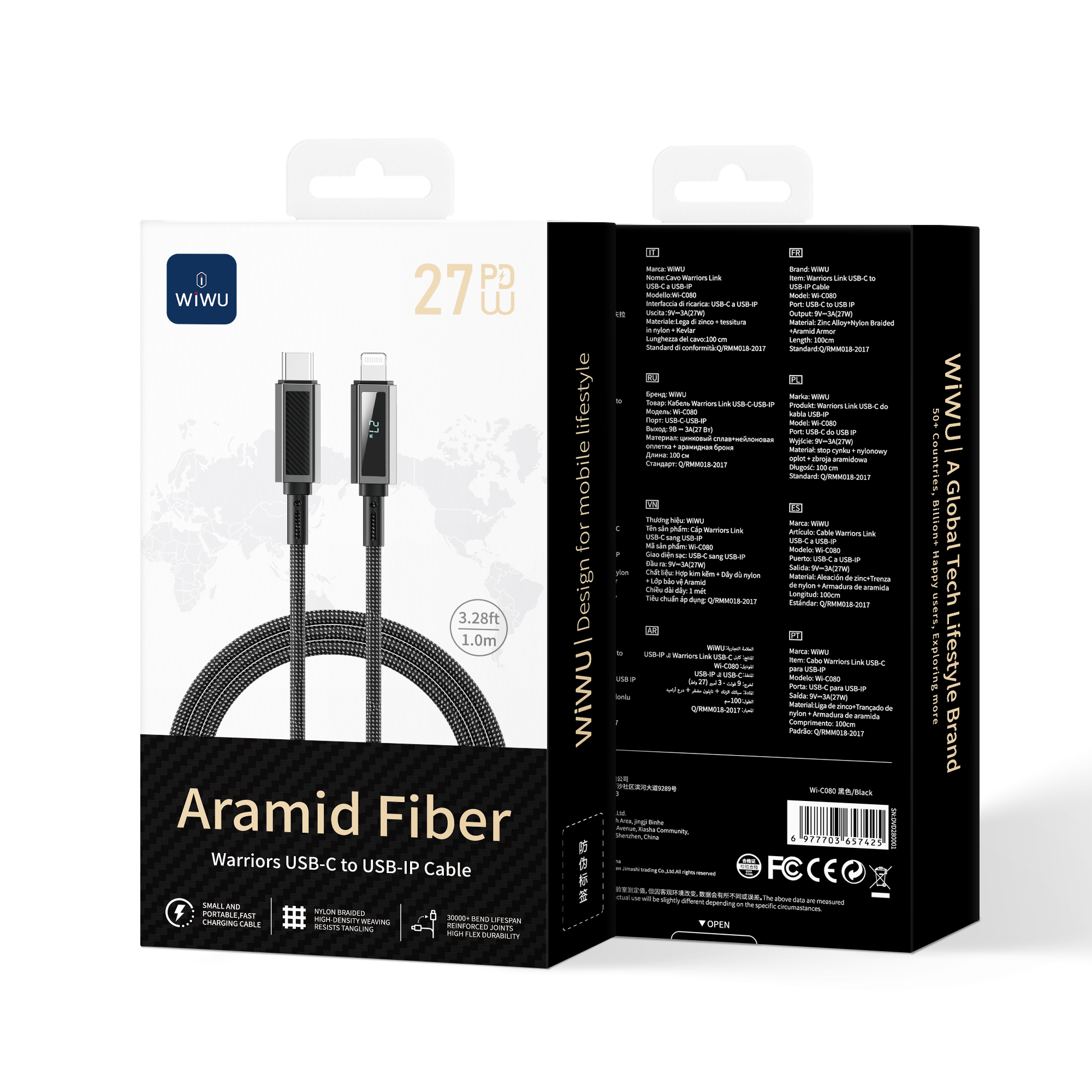 Wi-C080 виконаний у міцній комбінації матеріалів: цинковий сплав на конекторах забезпечує підвищену стійкість до зношування, а щільне нейлонове обплетення з додатковим зміцненням Kevlar робить кабель надзвичайно довговічним та стійким до розтягування й переломів. Довжина 1.2 м додає зручності у користуванні, а стильний чорний колір та металічні акценти надають аксесару преміального вигляду. Кабель виглядає солідно та легко витримує активну експлуатацію.