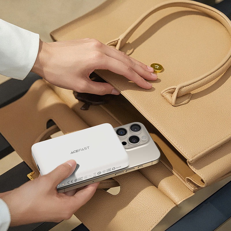 Acefast M26 виконаний у стильному білому кольорі з корпусом із вогнестійкого пластику PC. Компактні розміри 107*70*17.7 mm та вага 200 г роблять павербанк зручним для щоденного використання та подорожей. Магнітна зона для смартфона забезпечує надійну фіксацію під час бездротової зарядки, а мінімалістичний дизайн з плавними лініями підкреслює сучасний преміальний вигляд пристрою. На корпусі розташовані індикатори заряду та порт Type-C, а комплектний кабель Type-C доповнює функціональність та зручність використання.