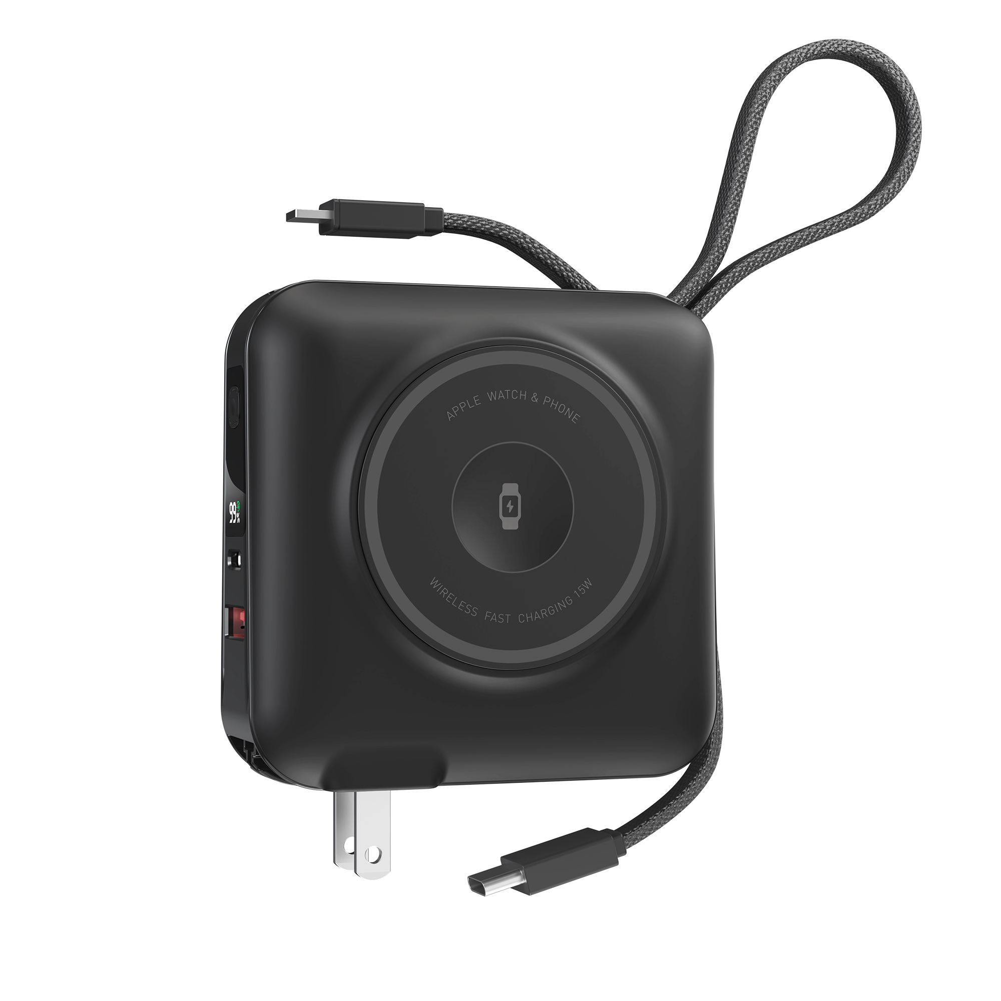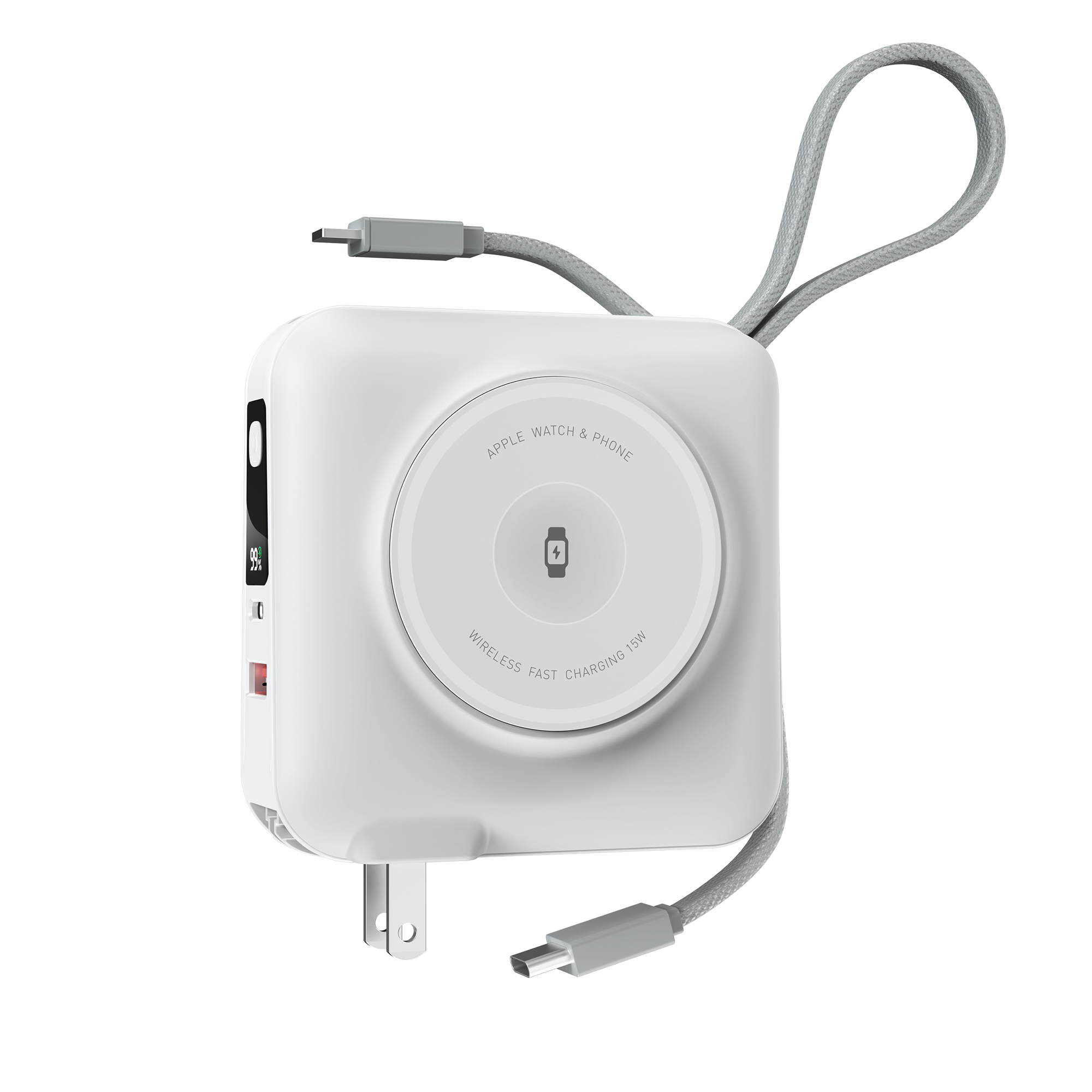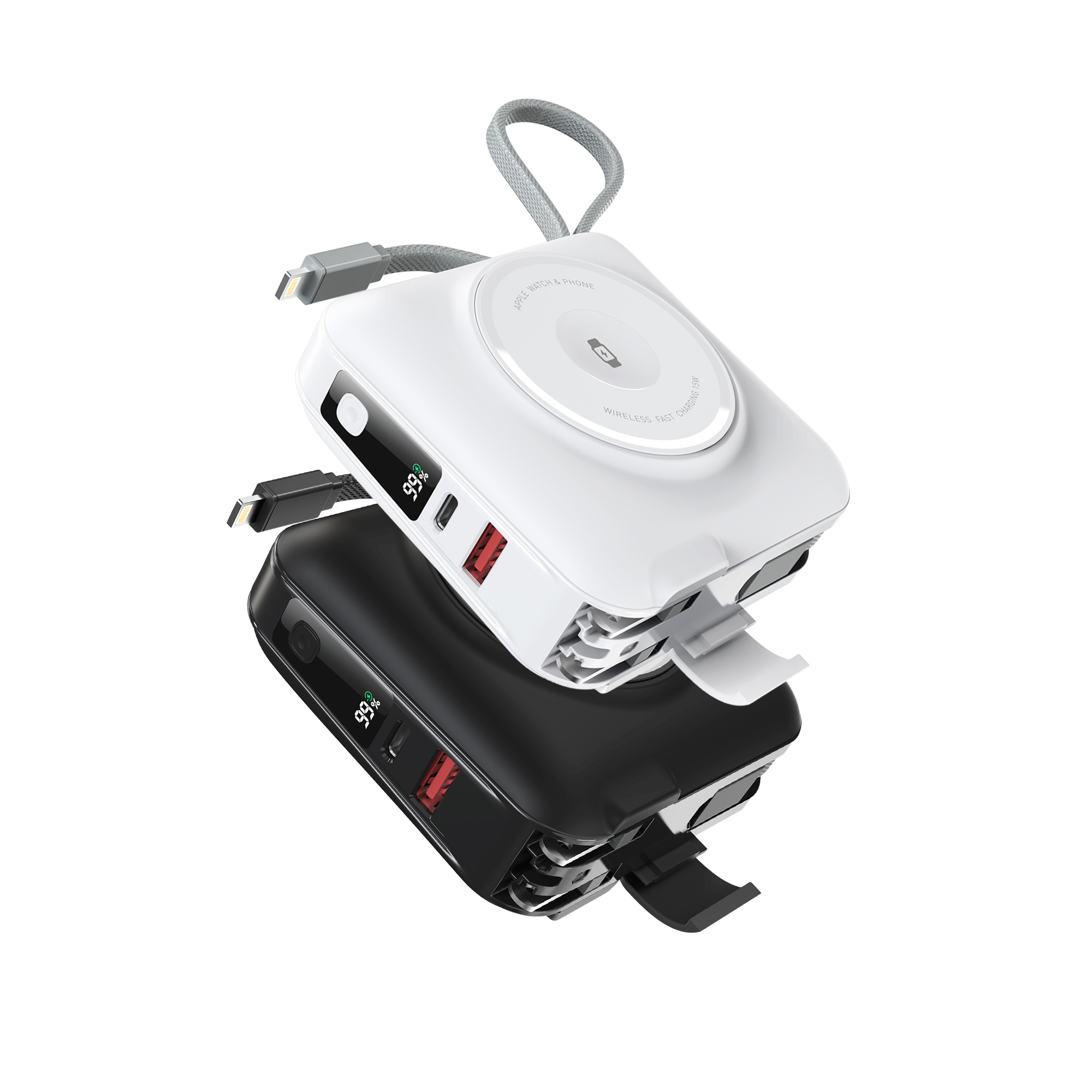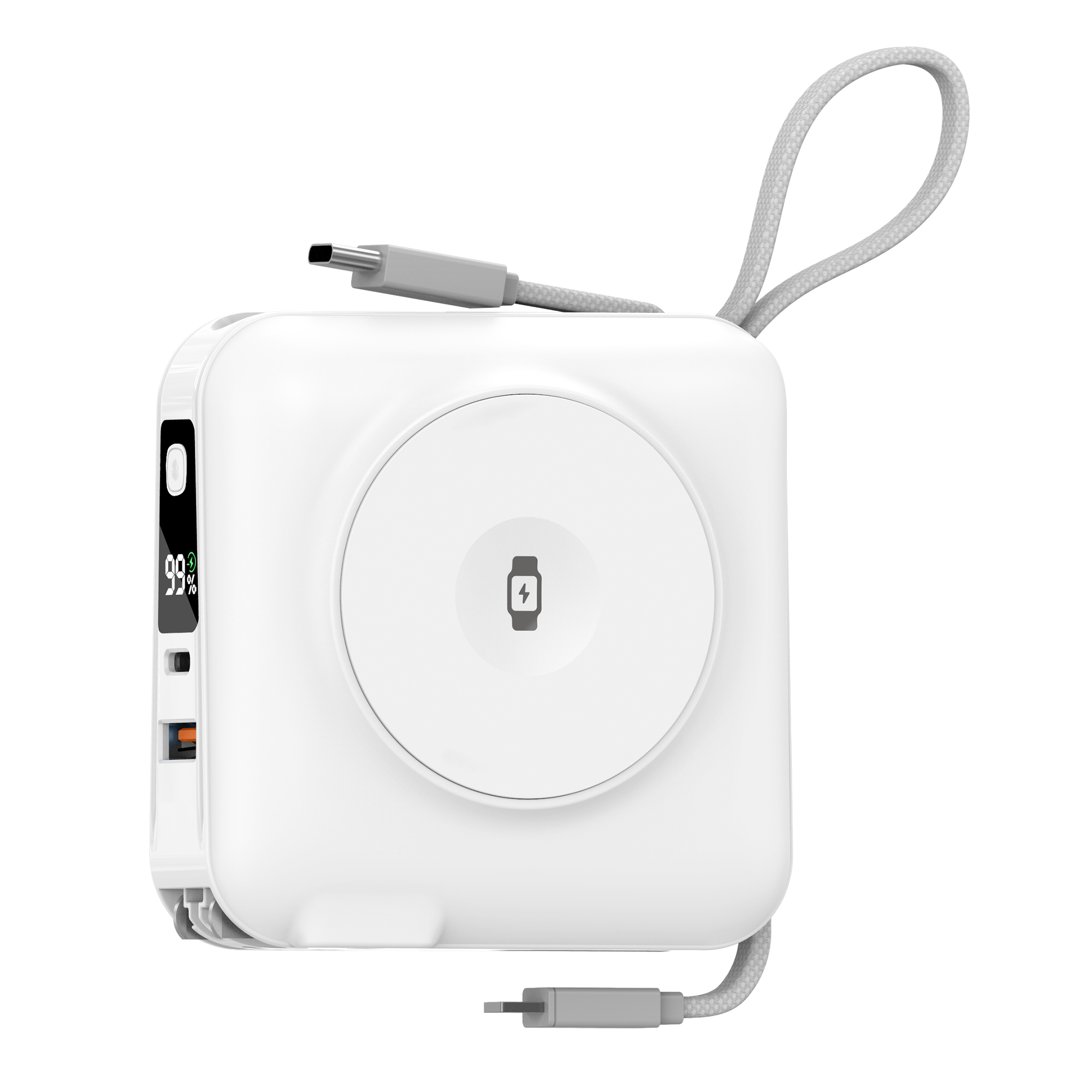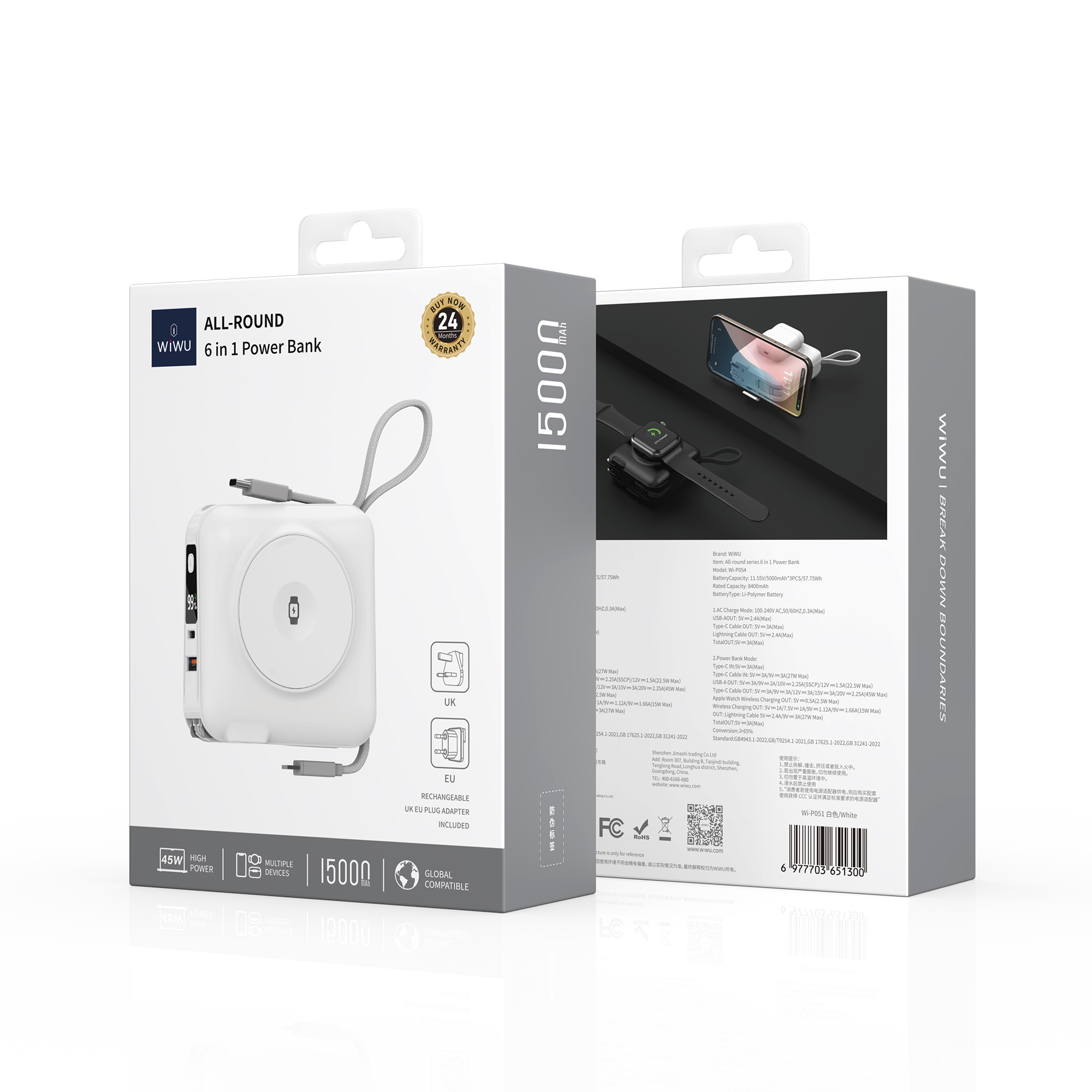 • ТехнологіїPower Bank Wi-P051 - це універсальний 6-в-1 пристрій з ємністю 15000 mAh та підтримкою швидкої зарядки до 45W, що дозволяє ефективно поповнювати енергію смартфонів, планшетів та навіть ноутбуків. Оснащений магнітною бездротовою зарядкою до 15W для телефону та 2.5W для смарт-годинника, а також двома вбудованими кабелями USB-C (45W Max) та Lightning (27W Max), він забезпечує заряджання одразу кількох девайсів. Порт USB-C з підтримкою input/output і стандартний USB роблять Wi-P051 сумісним практично з будь-якою технікою. На корпусі розташований цифровий дисплей, який відображає рівень заряду, а прихований кронштейн дає змогу комфортно встановити смартфон під час перегляду чи відеозв'язку.