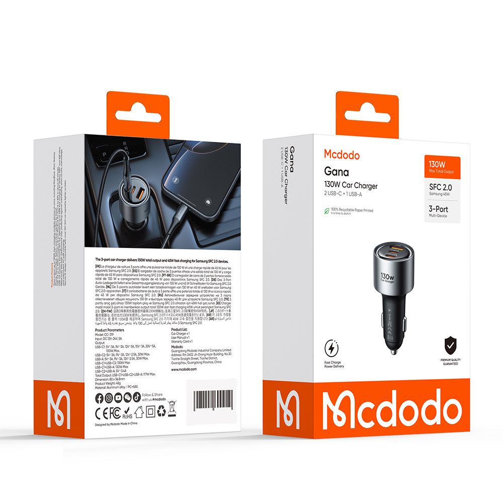 Mcdodo CC-3190 — це справжня енергетична станція у вашому автомобілі. Завдяки використанню технології GaN, цей компактний адаптер видає неймовірну сумарну потужність 130 Вт. Порт USB-C1 здатний самостійно забезпечувати до 100 Вт, що дозволяє повноцінно заряджати навіть потужні MacBook Pro або ігрові ноутбуки безпосередньо в дорозі. Три незалежні порти (2xUSB-C та USB-A) дозволяють одночасно живити ноутбук, планшет та смартфон на максимальних швидкостях. Інтелектуальний контролер останнього покоління миттєво адаптує напругу під кожен гаджет, гарантуючи безпеку акумуляторів та електроніки автомобіля.