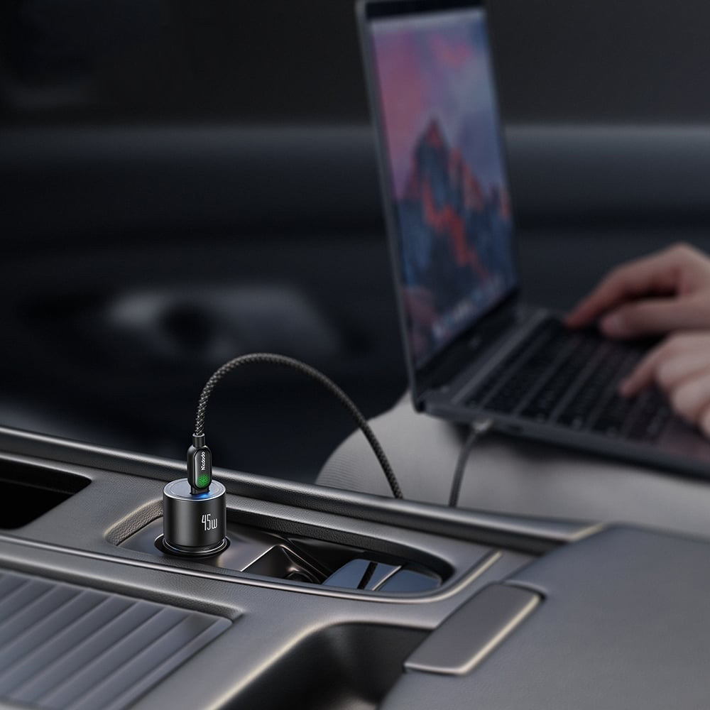 • ДизайнПристрій вирізняється вишуканим мінімалістичним дизайном, який гармонійно доповнює інтер'єр будь-якого автомобіля. Корпус виготовлений із високоякісного алюмінієвого сплаву, що не тільки надає преміального вигляду, а й сприяє швидкому відведенню тепла під час роботи. Компактні розміри дозволяють адаптеру майже повністю ховатися в гнізді прикурювача, не заважаючи перемиканню передач або використанню інших елементів панелі. Надійна контактна група забезпечує стабільне з'єднання навіть при сильній вібрації або їзді по нерівній дорозі.