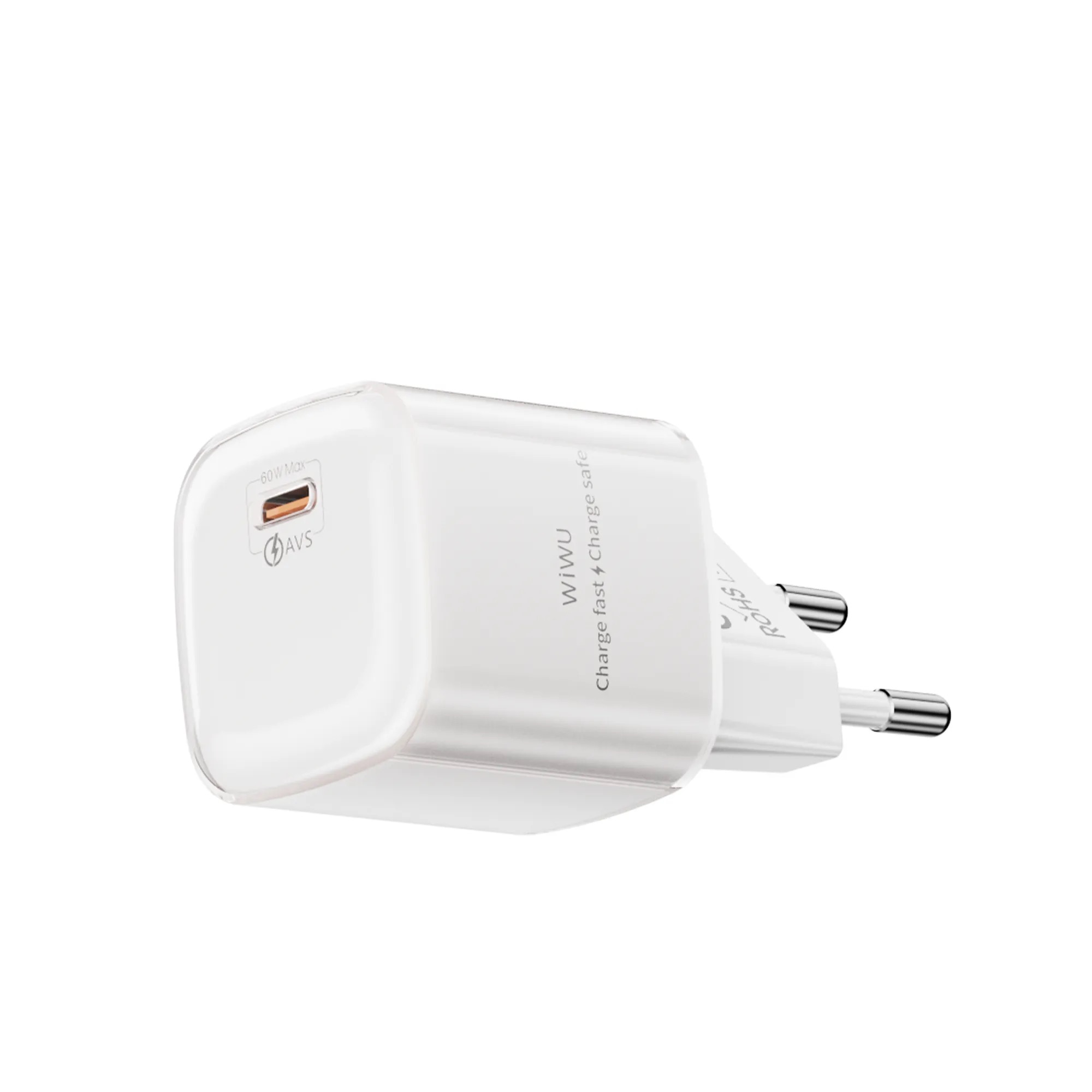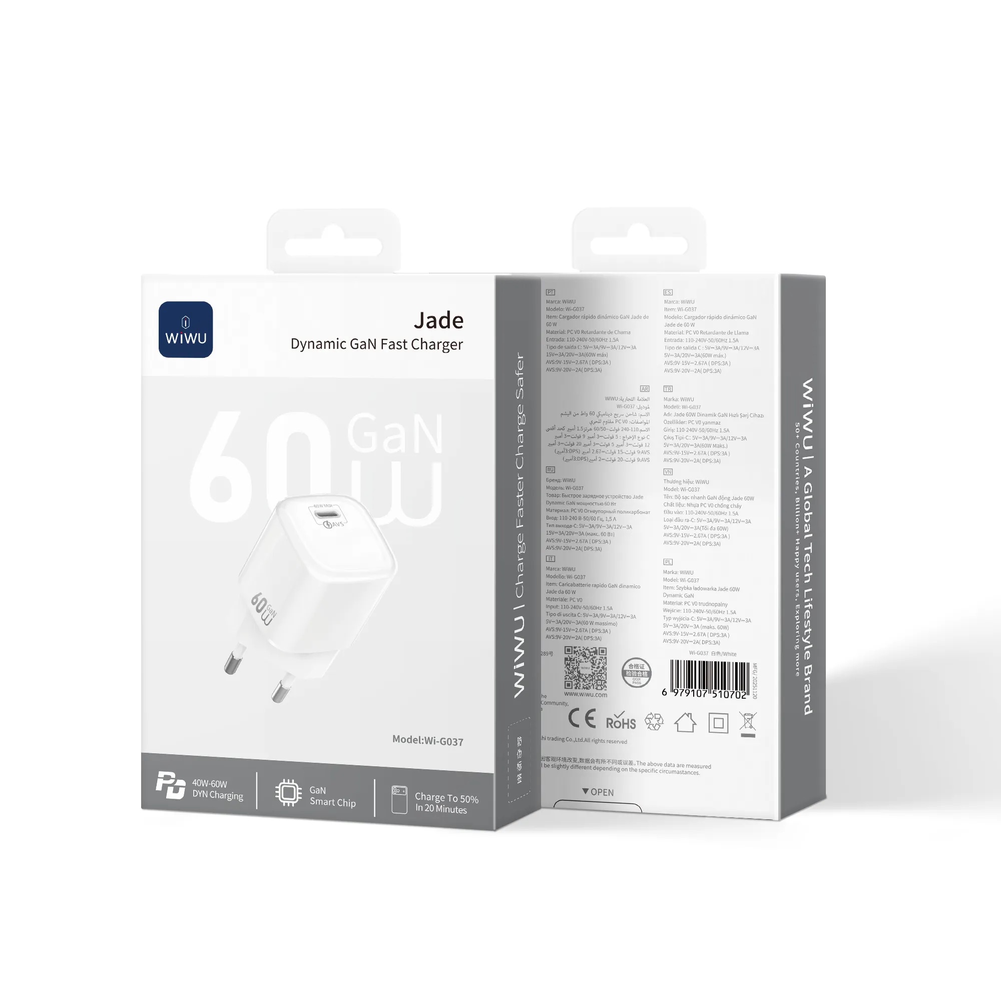 WiWU WI-G037 Jelly (Jade) 60W AVS GaN Fast Charger вирізняється ультракомпактним і легким дизайном у формі "желе" (jelly-like), що робить його одним з найменших і найпортативніших зарядних пристроїв на 60 Вт — ідеально поміщається в кишеню чи сумку для подорожей. Корпус виконаний з вогнестійкого PC V-0 матеріалу, що забезпечує високу міцність, безпеку та приємну тактильність. Версія з фіксованою EU-вилкою додає зручності для європейського ринку. Завдяки GaN-технології зарядка залишається маленькою, легкою та ефективною, з мінімальним нагрівом — елегантний і сучасний аксесуар для щоденного використання, бізнес-поїздок і активного життя.