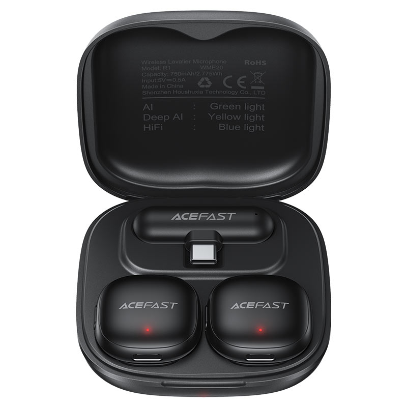 R1 має ультракомпактний і легкий дизайн: весь комплект важить лише 91 г, а зарядний кейс розміром 78 × 78 × 28 мм легко поміщається в кишеню чи сумку — ідеально для мобільних зйомок, подорожей чи щоденного використання. Корпус виконаний з міцного ABS-пластику, стійкого до подряпин і щоденного навантаження. Магнітне або кліпсове кріплення (залежно від комплектації) дозволяє швидко фіксувати мікрофони на одязі без зайвих дротів. Ресивер компактний і функціональний з портом для зарядки. Мінімалістичний стиль AceFast — матовий чорний колір, елегантні форми та практичність — підкреслюють сучасність і професійність пристрою для контенту-креаторів.