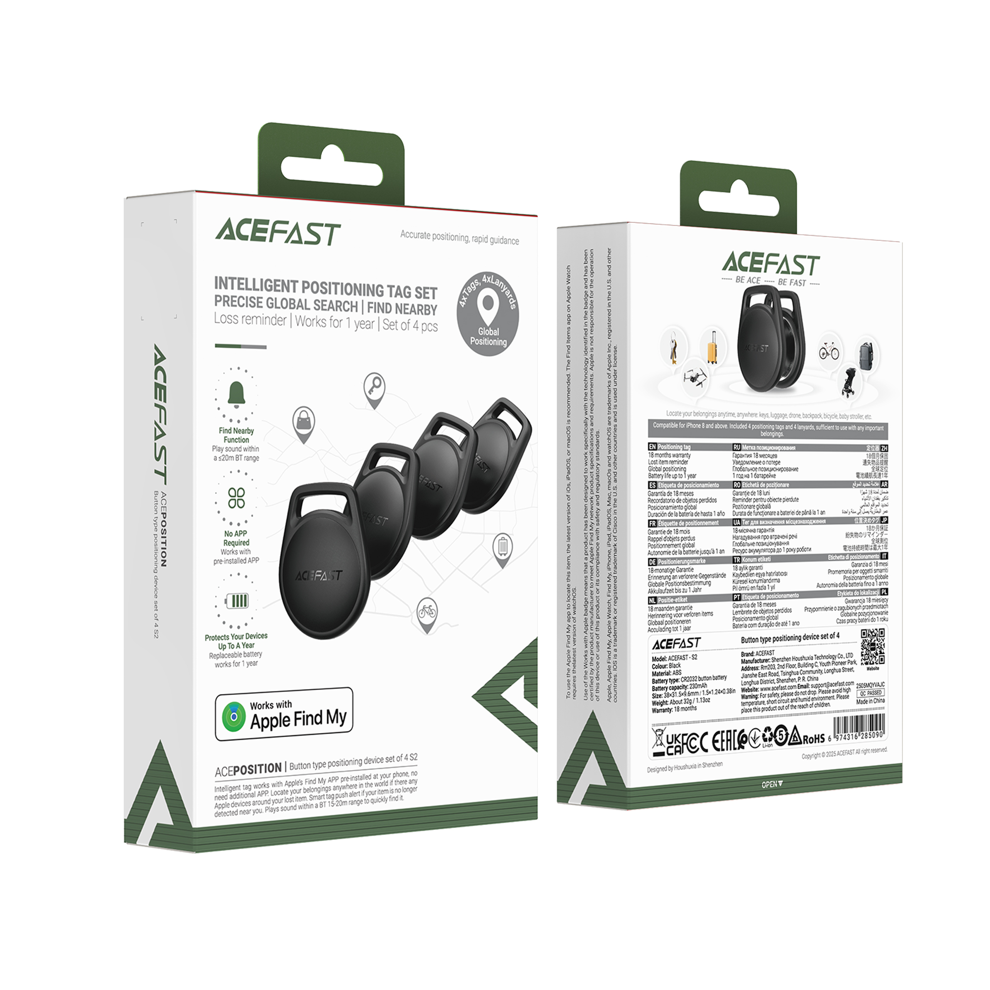 ACEFAST S2 виконаний у компактному та функціональному стилі з корпусом із високоякісного ABS, що робить його легким і міцним одночасно. Малий розмір φ31*9.3 мм та вага 8 г дозволяють легко прикріпити пристрій до сумки, ключів, велосипеда або автомобіля. Пристрій оснащений зручним шнурком для перенесення, а мінімалістичний дизайн підкреслює сучасний вигляд аксесуара. У комплекті йдуть 4 пристрої.