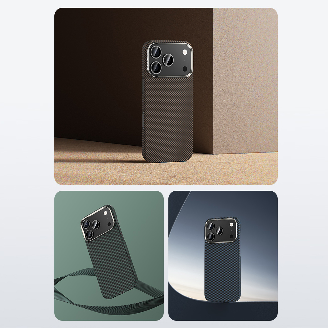 Чохол доступний у двох стильних кольорах: темно-зеленому та коричневому, що підкреслюють його елегантність і сучасний вигляд. Завдяки тонкому дизайну товщиною 1.6 мм і легкості Air-версії, він практично не відчувається у використанні, забезпечуючи комфортні тактильні відчуття. Металевий захист для блоку камер гарантує надійність і довговічність, поєднуючи практичність зі стильним дизайном.