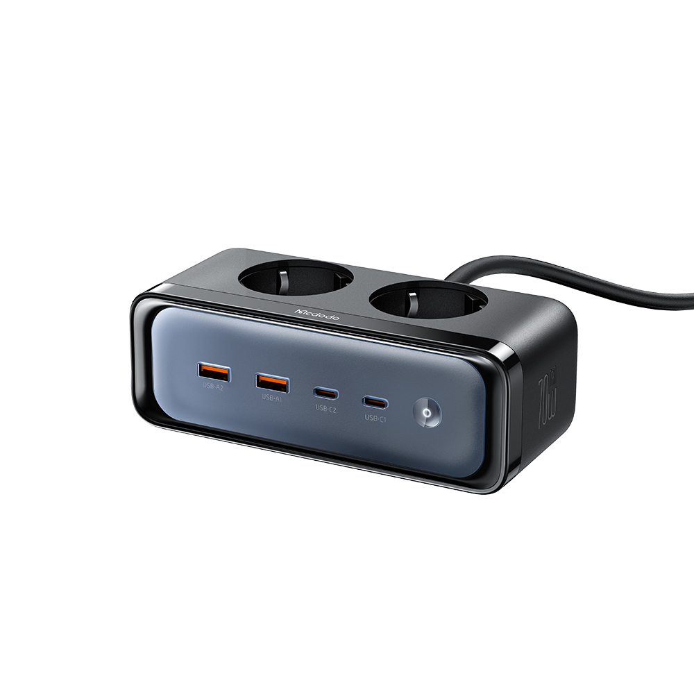 Mcdodo CH-4610 — це компактний та стильний подовжувач чорного кольору з європейською вилкою, виготовлений із вогнестійкого пластика. Його розміри 142*64*50,5 мм і вага 530 г роблять його зручним для використання вдома чи в офісі. Завдяки довгому кабелю (1,5 м) та ергономічному дизайну, пристрій легко розміщується на столі або в робочій зоні. Він оснащений двома розетками AC, двома портами USB-A та двома портами USB-C, що дозволяє заряджати до шести пристроїв одночасно.