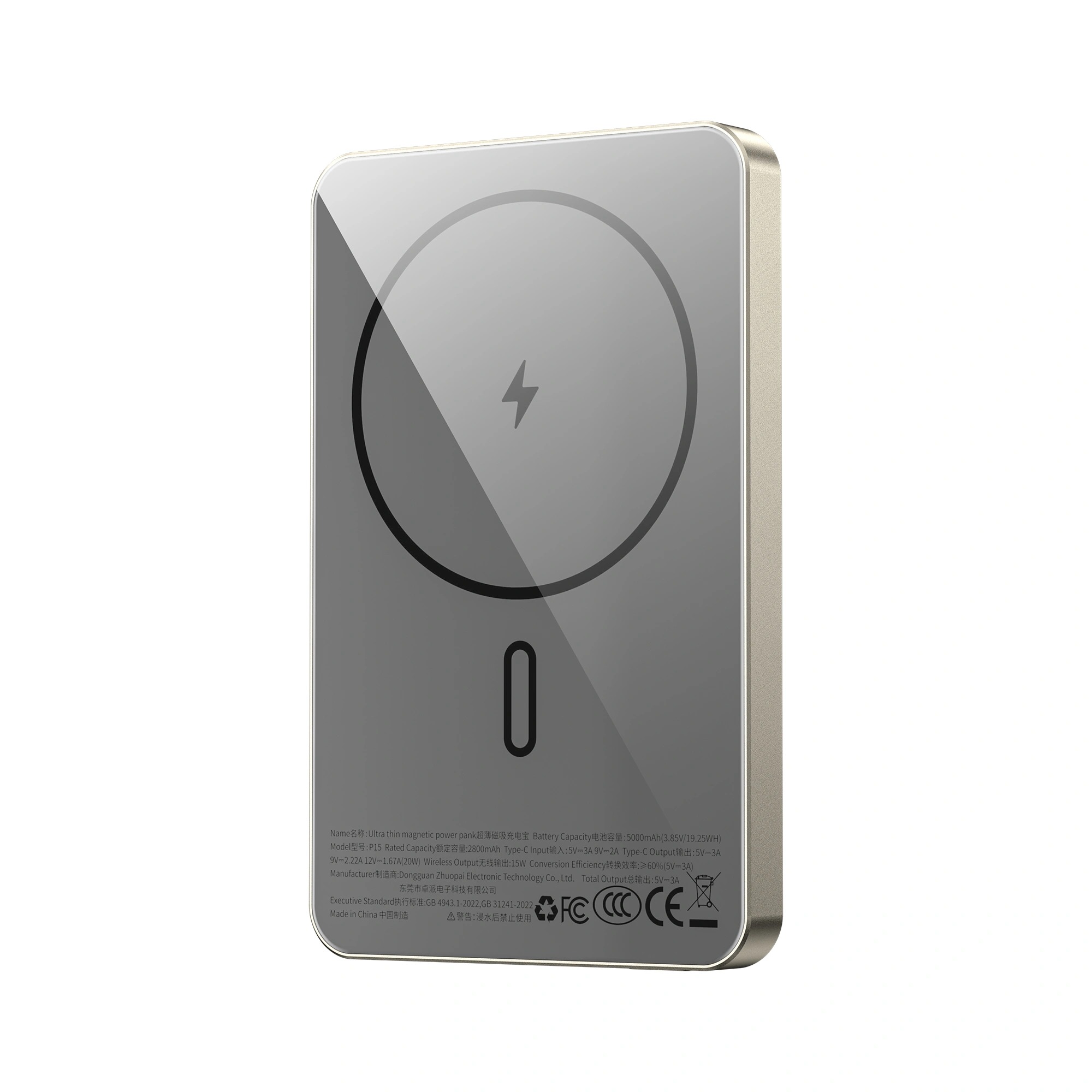 WiWU P15 у версії з ємністю 5000 mAh зберігає той самий надтонкий та стильний форм-фактор, виконаний у преміальному кольорі Titanium Gold. Його легкий і компактний корпус ідеально підходить для щоденного носіння — він легко поміщається в кишеню, сумку чи навіть чохол смартфона. Магнітна поверхня забезпечує надійне фіксування смартфона під час бездротової зарядки, а мінімалістичний дизайн підкреслює сучасний і преміальний вигляд пристрою. На корпусі розміщені індикатор заряду, кнопка увімкнення та один універсальний порт Type-C. У комплекті йде кабель Type-C, який доповнює практичність павербанка.