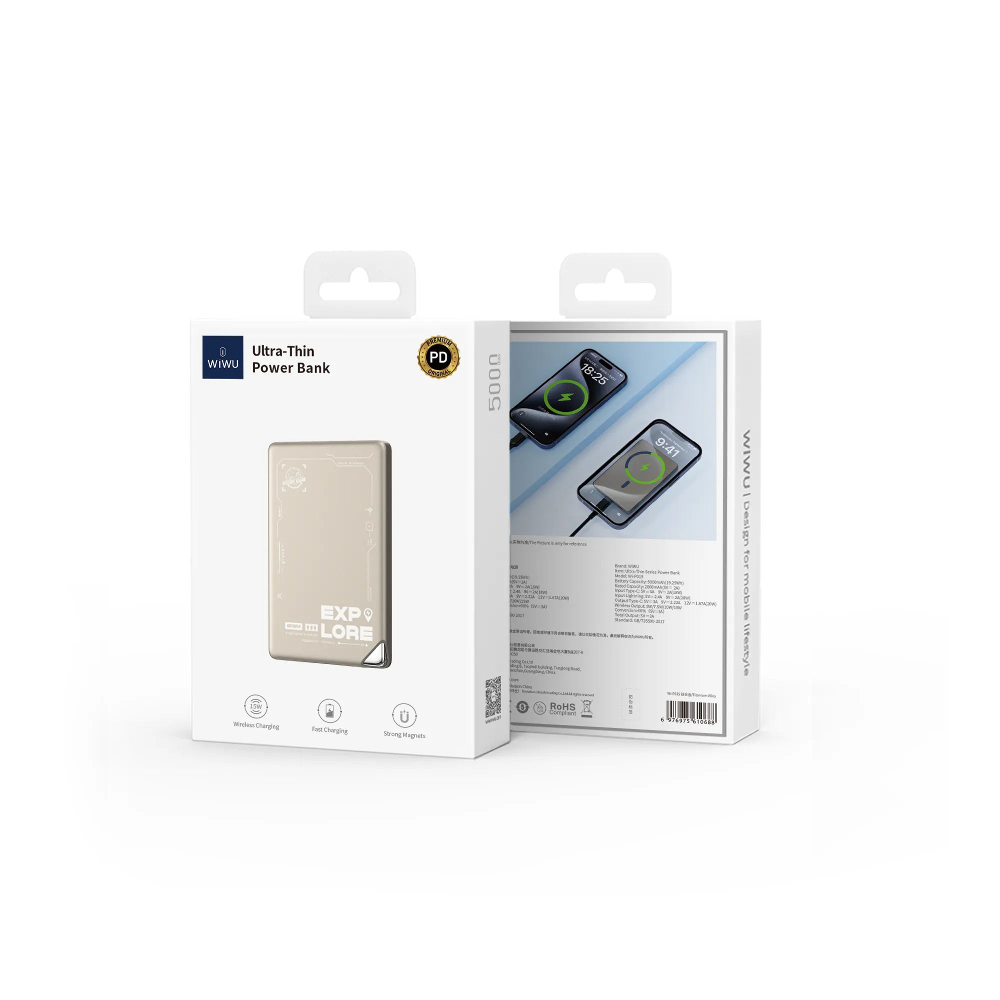WiWU Wi-P019 виконаний у стильному титановому кольорі, що додає йому преміального вигляду. Ультратонкий і легкий корпус робить його ідеальним для щоденного носіння та подорожей. Виготовлений із високоякісних матеріалів, пристрій має міцну конструкцію з магнітною поверхнею для надійного кріплення сумісних гаджетів під час бездротової зарядки. Гладка текстура та мінімалістичний дизайн підкреслюють сучасний стиль бренду WiWU. Можливість заряджання через Lightning додає практичності для власників пристроїв із цим інтерфейсом.
