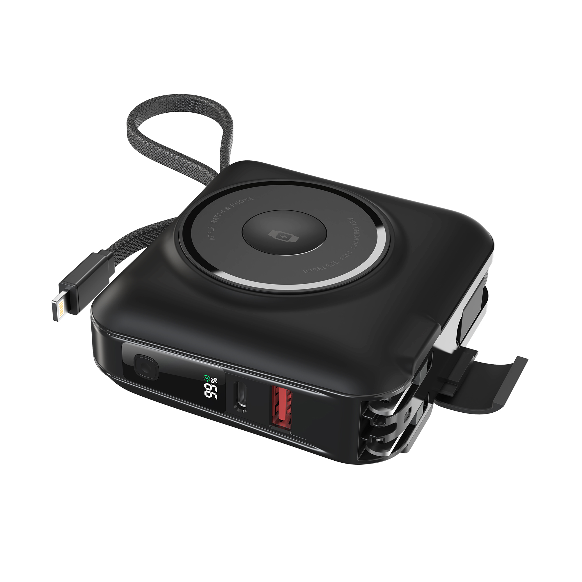 • ТехнологіїPower Bank Wi-P051 - це універсальний 6-в-1 пристрій з ємністю 15000 mAh та підтримкою швидкої зарядки до 45W, що дозволяє ефективно поповнювати енергію смартфонів, планшетів та навіть ноутбуків. Оснащений магнітною бездротовою зарядкою до 15W для телефону та 2.5W для смарт-годинника, а також двома вбудованими кабелями USB-C (45W Max) та Lightning (27W Max), він забезпечує заряджання одразу кількох девайсів. Порт USB-C з підтримкою input/output і стандартний USB роблять Wi-P051 сумісним практично з будь-якою технікою. На корпусі розташований цифровий дисплей, який відображає рівень заряду, а прихований кронштейн дає змогу комфортно встановити смартфон під час перегляду чи відеозв'язку.